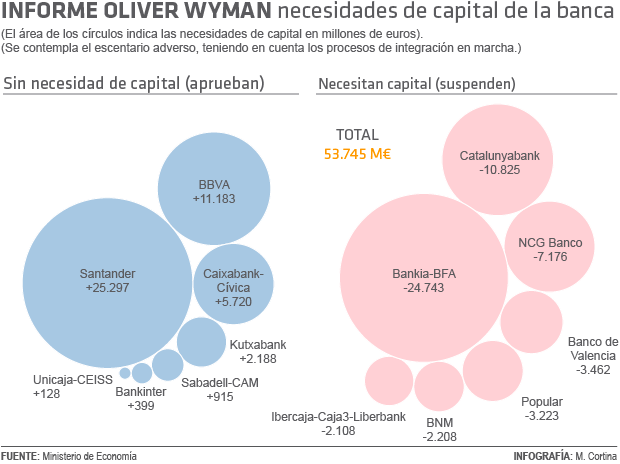 El test de estrés realizado por Oliver Wyman cuantificó ayer, después de cuatro meses de trabajo, la necesidad final de capital del sector financiero español. Enmarcada en el rescate bancario pactado con Europa, la prueba ha revelado que siete entidades (BFA-Bankia, Catalunya Banc, NCG Banco, Banco de Valencia, Popular, BMN y la unión de Ibercaja y Liberbank) requieren un refuerzo de 53.745 millones. El importe sube a 59.300 millones, si no se tienen en cuenta los efectos contables de las fusiones y los créditos fiscales.